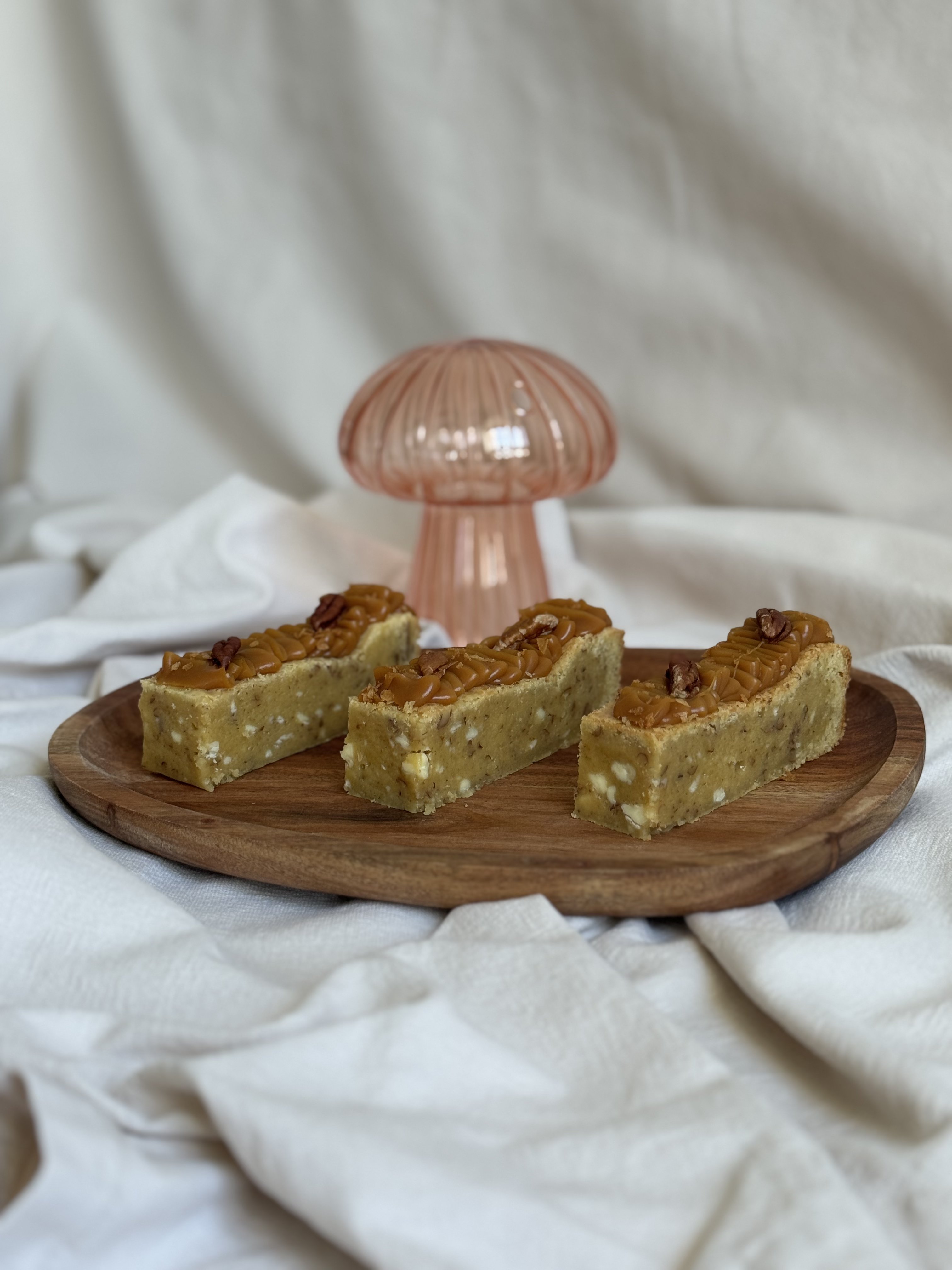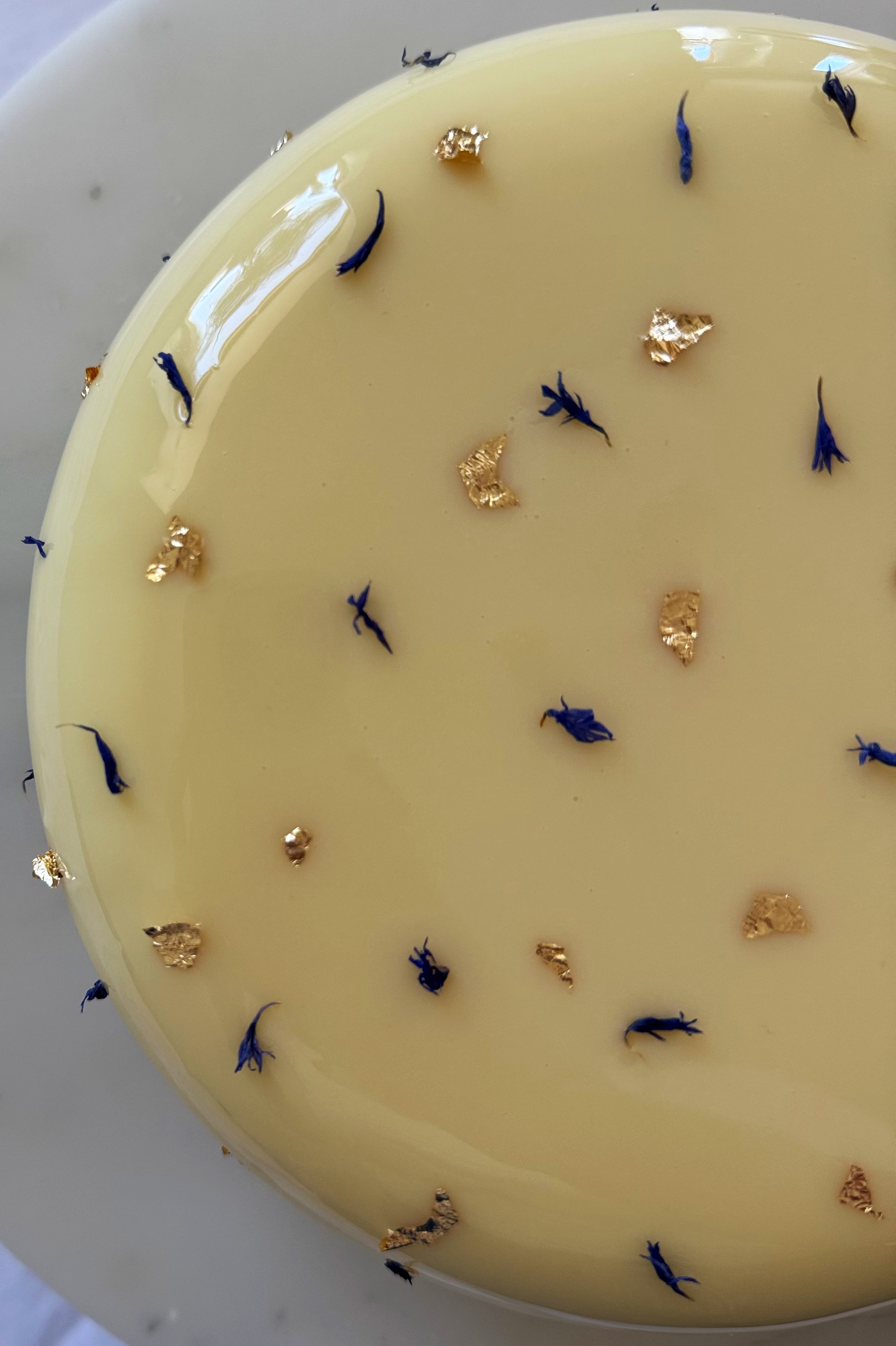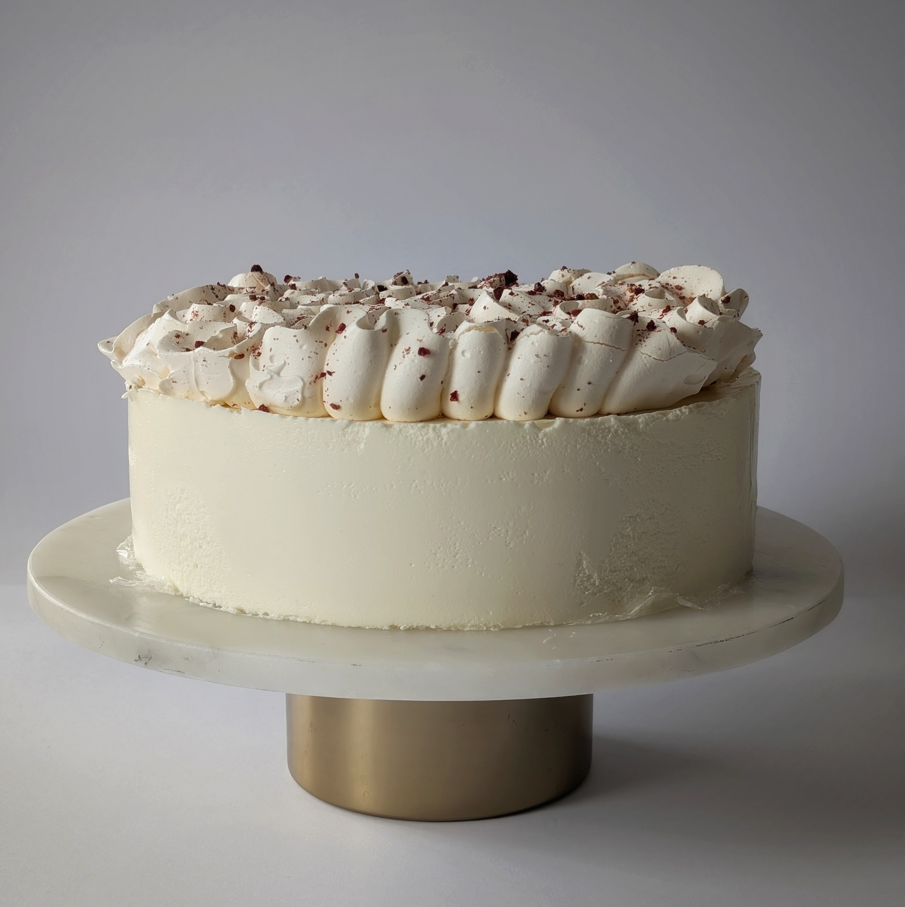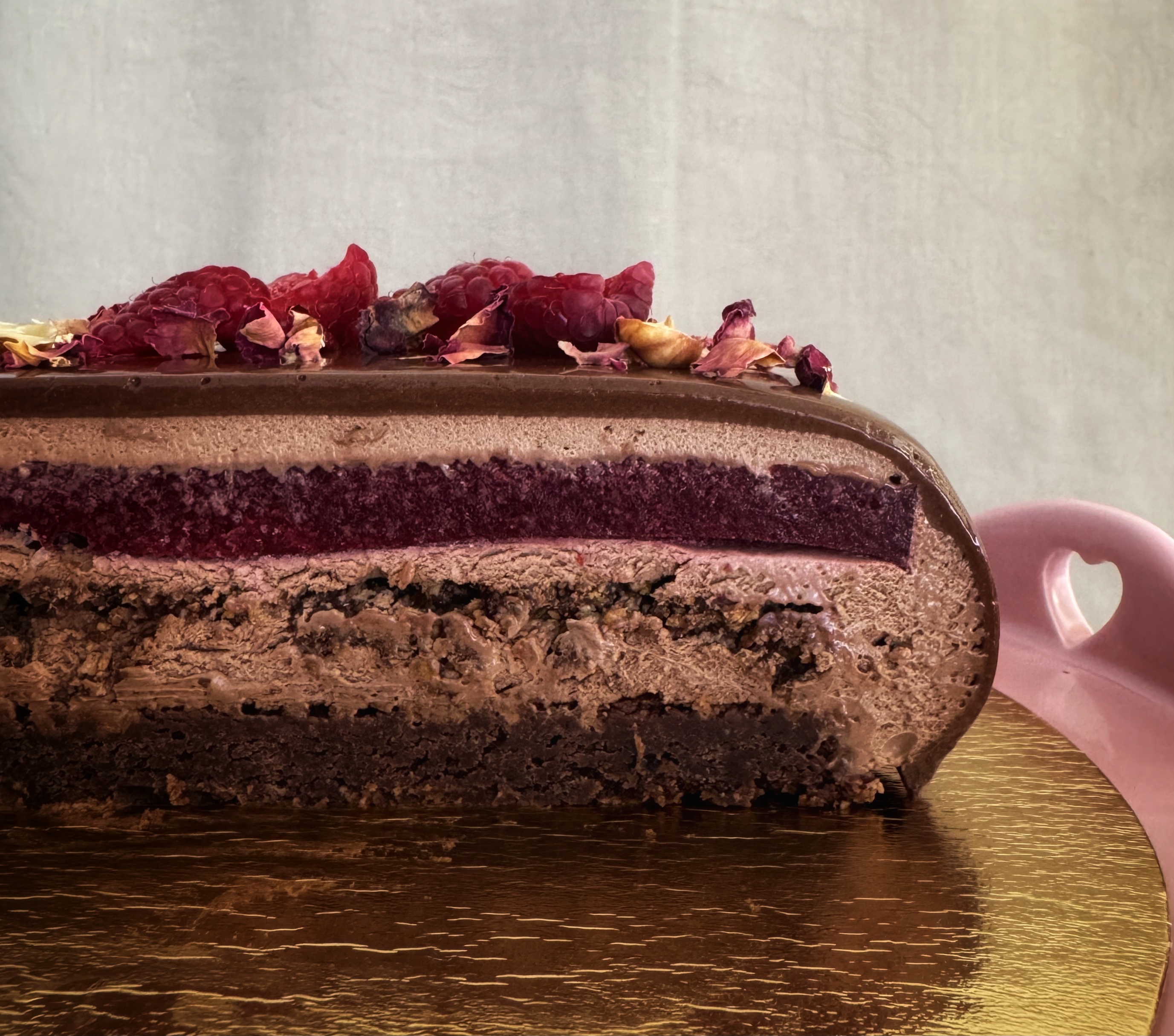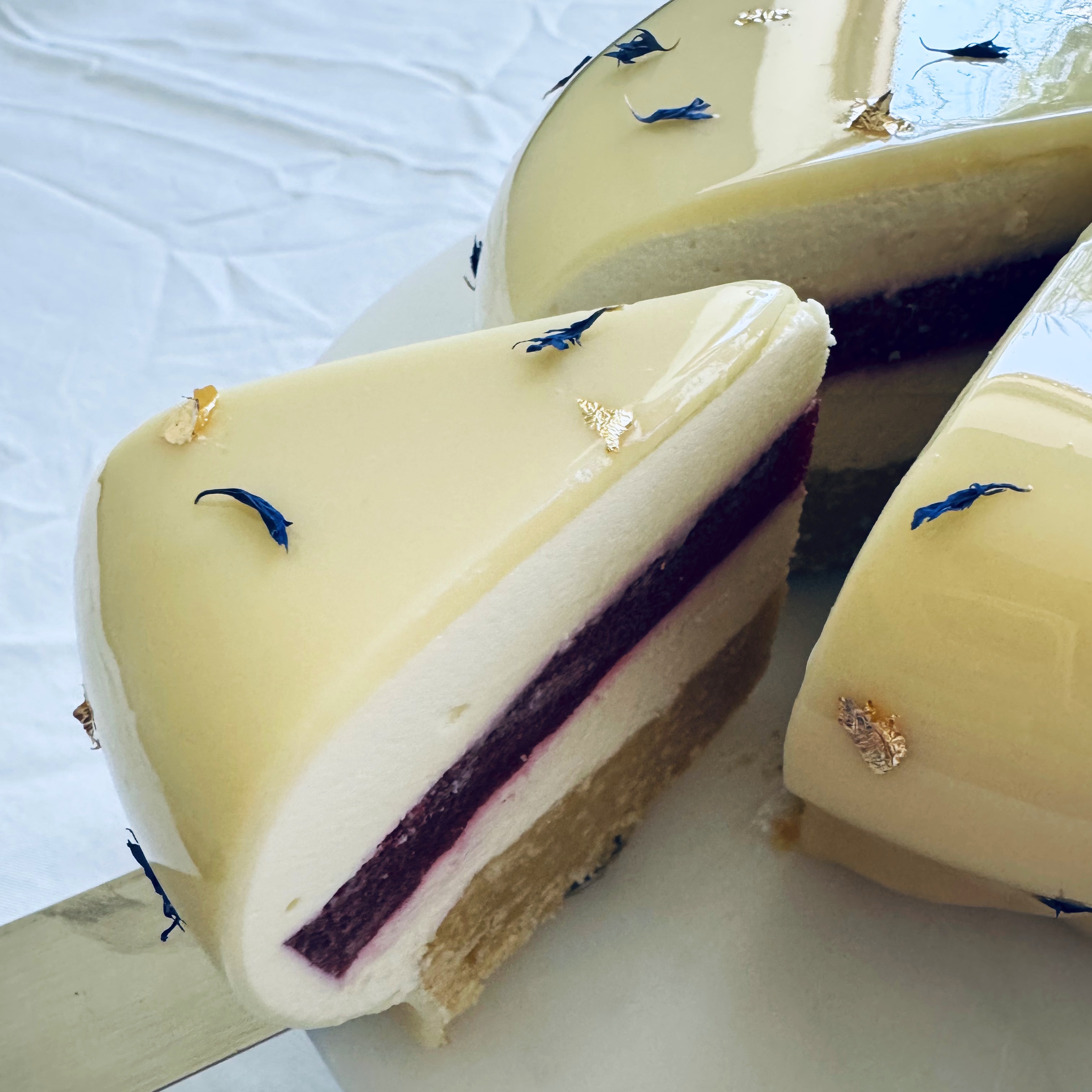 To wyrafinowane ciasto musowe łączy w sobie elegancję i zaskakującą głębię smaków. Na spodzie znajduje się sezamowe blondie – wilgotne, maślane ciasto z nutą prażonego sezamu, które nadaje całości wyjątkowego, lekko orzechowego charakteru. Wyżej rozpościera się delikatny mus z białej czekolady aromatyzowany trawą cytrynową i liśćmi limonki kaffir. W samym sercu – żelka malinowa, intensywna i owocowa, której lekka kwasowość idealnie równoważy słodycz musu i głębię sezamu.